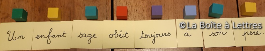 Je vous en propose une version colorisée. On a assez peu d’information sur la façon d’utiliser ce matériel. On peut penser qu’il s’agit d’un travail en autonomie. Le tableau de grammaire, lui, fonctionne très bien en travail de groupe.