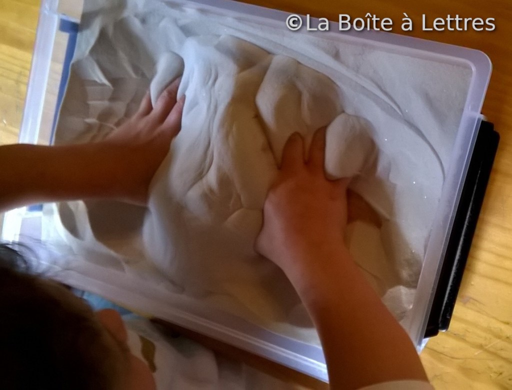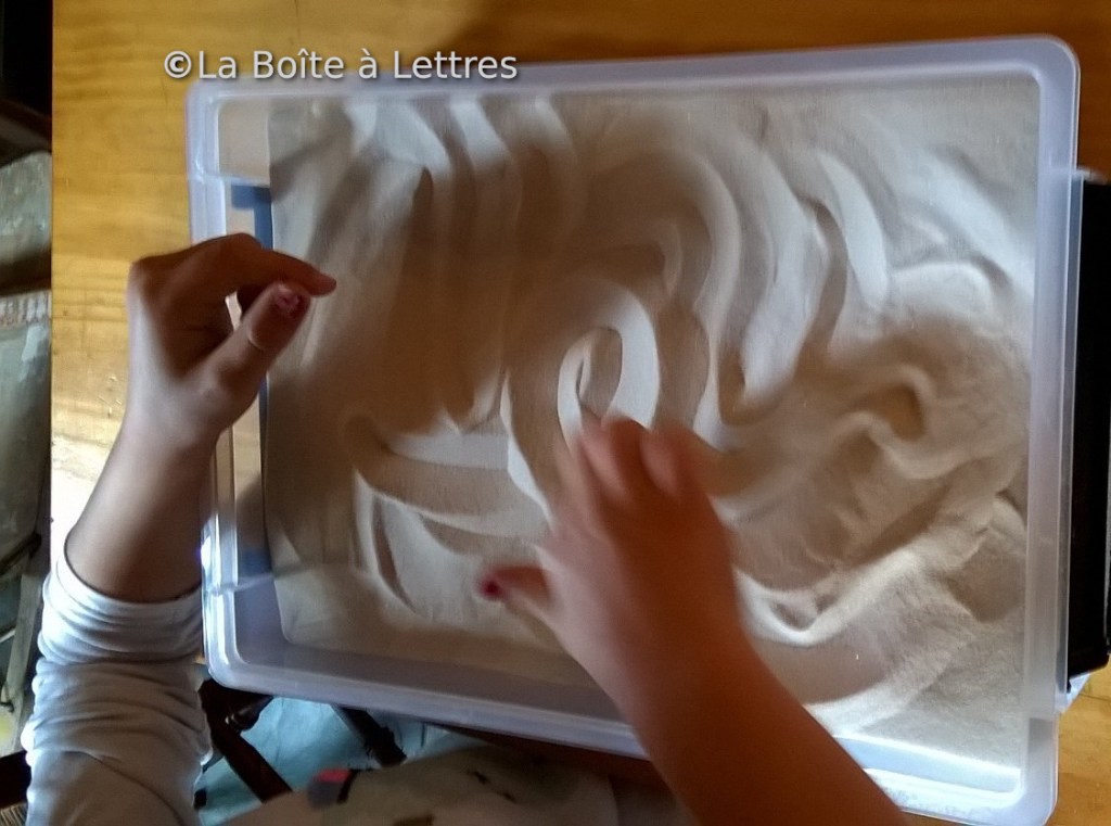 On écrit dans le très doux sable Montessori, et puis on joue avec !