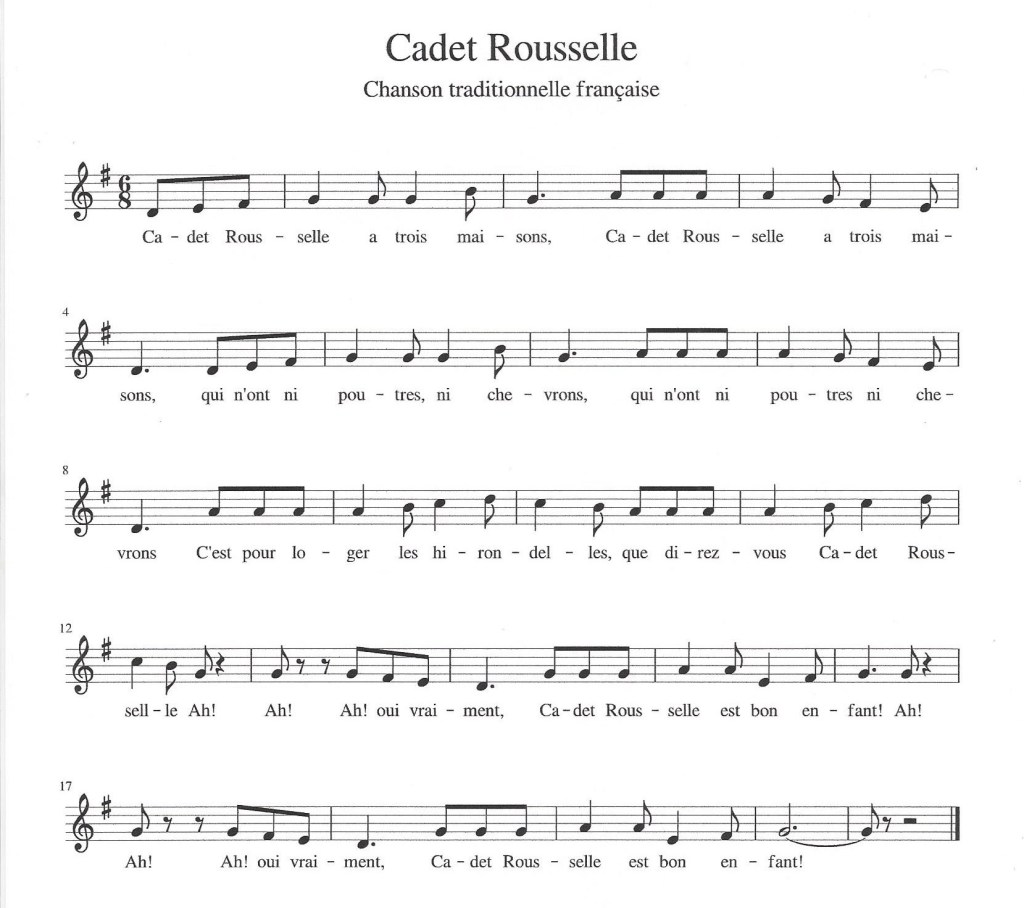 4. Cadet Rousselle a trois souliers (bis), Il en met deux dans ses deux pieds (bis)