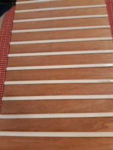Le tableau est fait avec une plaque de contreplaqué de 9mm d’épaisseur et de 0,90m x 0,50m. Tous les 6,5cm on colle un profilé de PVC qui a la forme de U dans lequel on pourra glisser les mots en fonction de leur nature.