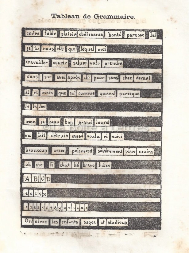 Ce tableau est présenté à la page 75 du Manuel de la Phonomimie de 1875. Je rappelle que le procédé phonomimique de Grosselin a d’abord été utilisé avec ses petits enfants puis dans les salles d’asile, notamment grâce à l’enthousiasme de Marie Pape-Carpantier. Le Manuel a donc été écrit après la mort de son concepteur, par son biographe Louis-Auguste Bourguin et son fils Émile Grosselin, à partir des notes de Augustin Grosselin et des cahiers de Mademoiselle Gaudon, qui utilisait la méthode dans sa Salle d’Asile de la rue Berthollet à Paris.