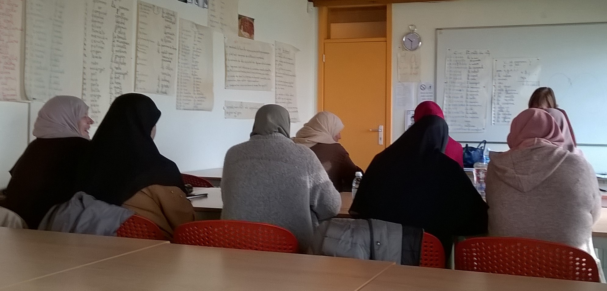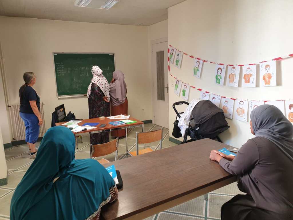 Nous avons ainsi sur Pau un groupe de jeunes femmes allophones qui ne sont jamais allées à l’école, ni en France ni dans leur pays d’origine. Elles apprennent donc à parler, mais aussi à lire et à écrire en français. Cet acte de décodage et d’encodage est complètement nouveau pour elles. Les outils utilisés sont ceux présentés dans le livre « Lire, Écrire, Chanter » : manuel de lecture, alphabet mobiles, cahier d’écriture, phonomimie. Cela marche très bien, notamment grâce à l’aide de la phonomimie.