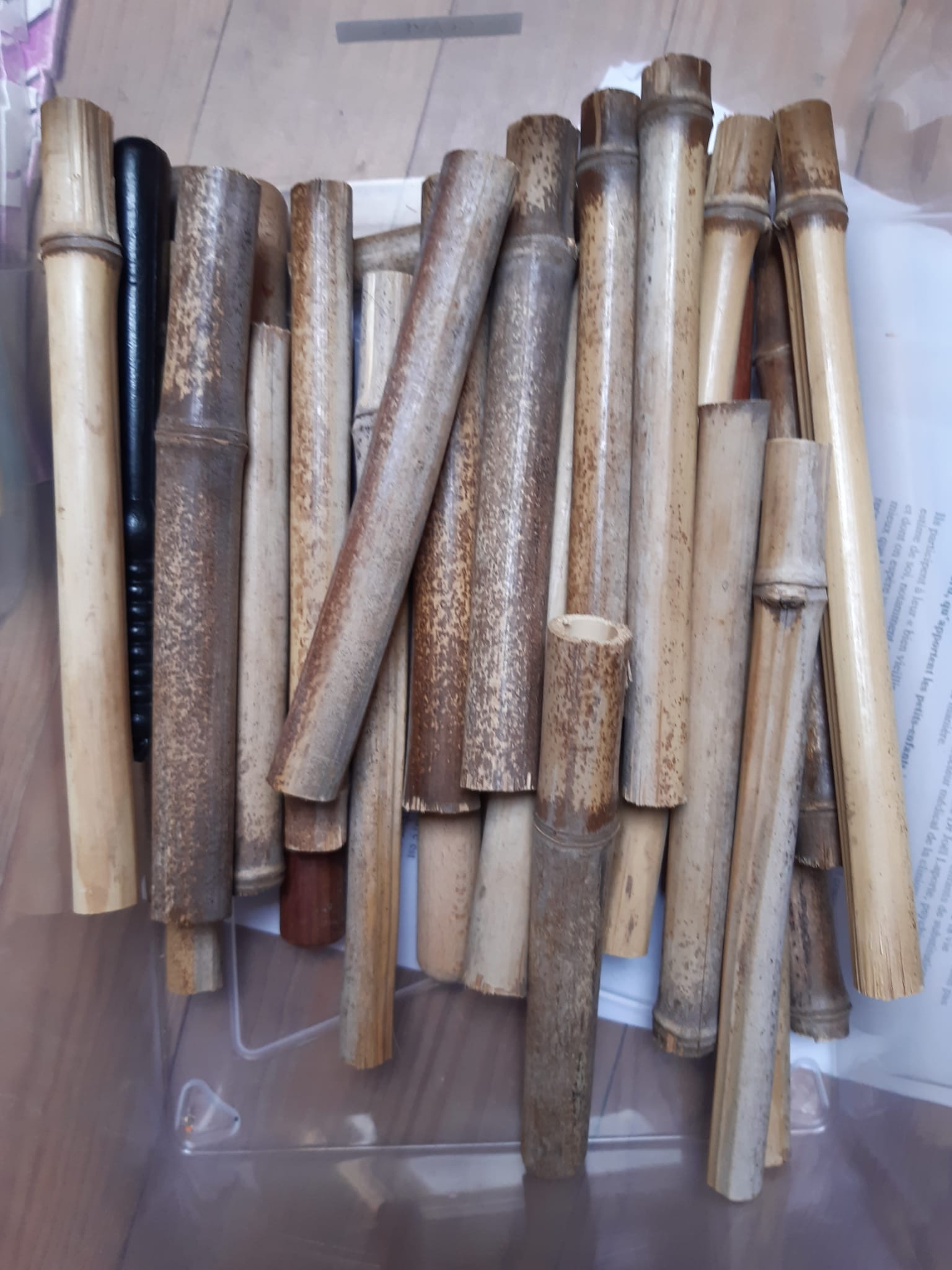 Vous lui demandez d’aller couper des bambous, ou qu’il le fasse pour vous, en prenant des tiges entre 2 et 3cm de diamètre. Vous les coupez en tronçons d’environ 25 cm, et vous avez des claves parfaites. Attention toutefois à ne pas les fendre, leur son les rend alors inutilisables.